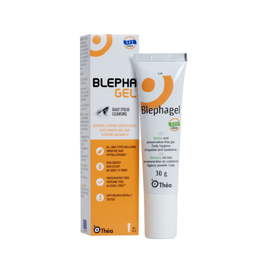 Blephagel 30g, a hypoallergenic sterile gel for daily hygiene and cleaning of eyelids and eyelashes.