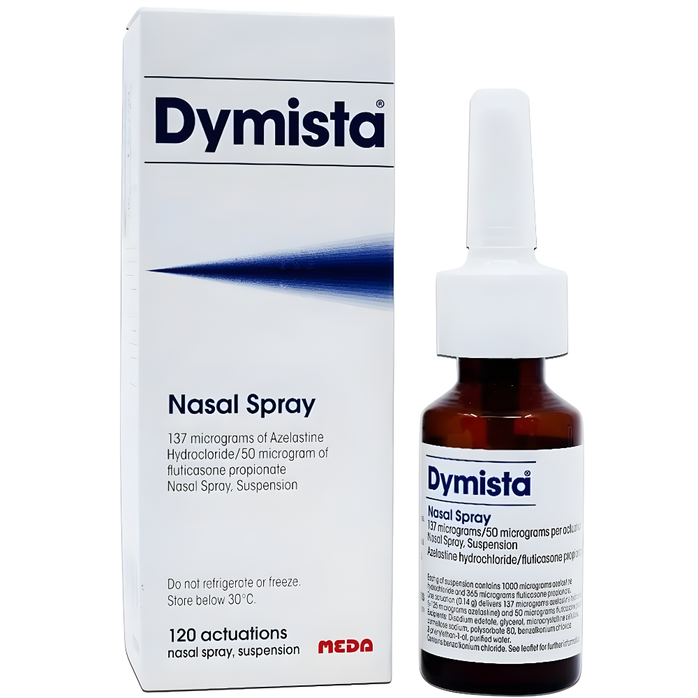Contains azelastine hydrochloride, an antihistamine, and fluticasone propionate, a corticosteroid.
